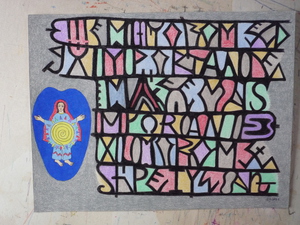 2026kleurpotloodtekening. Abstracte compositie met Madonna in diepblauw, zwart en rood.