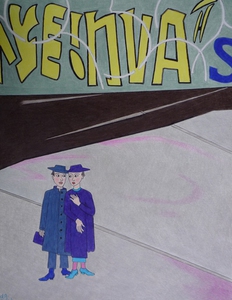 2026kleurpotlood. twee personen in blauw op een groot plein. Gele graffiti.