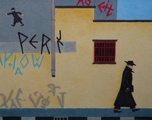2026kleurpotloodtekening. wand met omhoog strevende zwarte vormen. man in zwarte jas met hoed