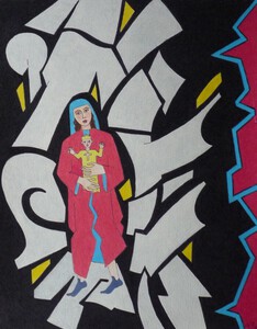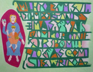 2025Madonna 5. kind op schoot. veel-keurige tekst in groen.
